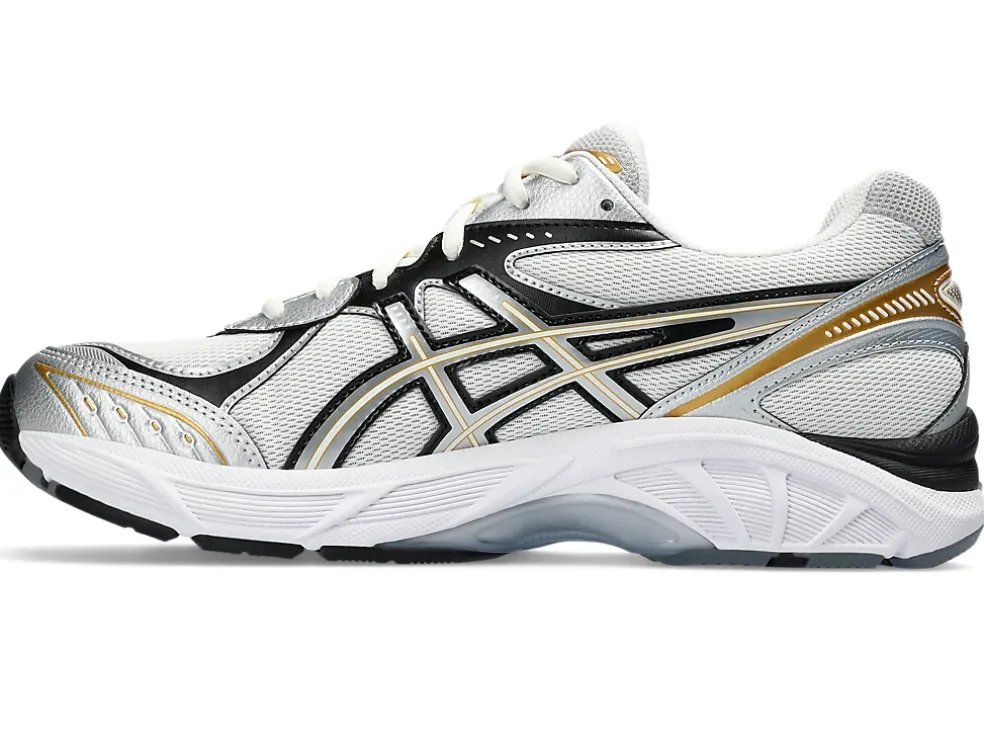 Maar ook andere invloedrijke details uit de jaren 2010 zoals een gesegmenteerde tussenzool en inzetstukken met GEL technologie. Dit levert een schoen op met industriële look én geavanceerde demping.